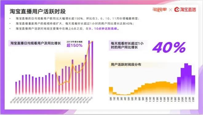 《報告》顯示,淘寶直播的日均觀看用戶數(shù)同比大幅增長超150%,環(huán)比在3、6、10、11月份增幅最明顯;淘寶直播重度用戶的規(guī)模持續(xù)擴大,每天觀看時長超過1小時的用戶同比增長達(dá)到40%。