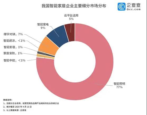家電不再是冷冰冰的擺設,而是被賦予了審美和情感需求的個性化智能產(chǎn)品。智能家居作為新興行業(yè),其無接觸式的交互方式,給疫情期間的人民帶來安全、智能的生活體驗,其優(yōu)勢開始凸顯。企查查整理了我國智能家居企業(yè)八大細分市場,數(shù)據(jù)表明智能照明、智能家電、樓宇對講相關(guān)企業(yè)占比較高,分別為77%,9%,7%;此外,家庭安防和智能影音也頗受市場青睞。