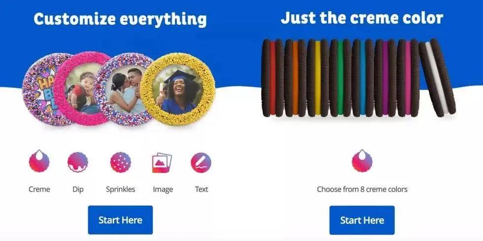 前段時間,奧利奧首次推出定制餅干服務。奧利奧提供了兩種定制方式,一種是你的餅干你做主,消費者可以自己選擇奶油顏色,紅橙黃綠紫白,盡可挑選。